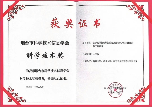 近期,2024年度烟台市科学技术信息学会科学技术奖颁奖典礼在中国科研实验室烟台海岸带研究所隆重举行。J9国际站 J9信息与烟台大学、苏州大学联合完成的 "基于宽带物理熵源的超高速密钥产生关键技术及工程应用项目荣获科学技术奖二等奖。